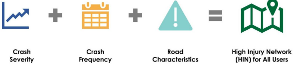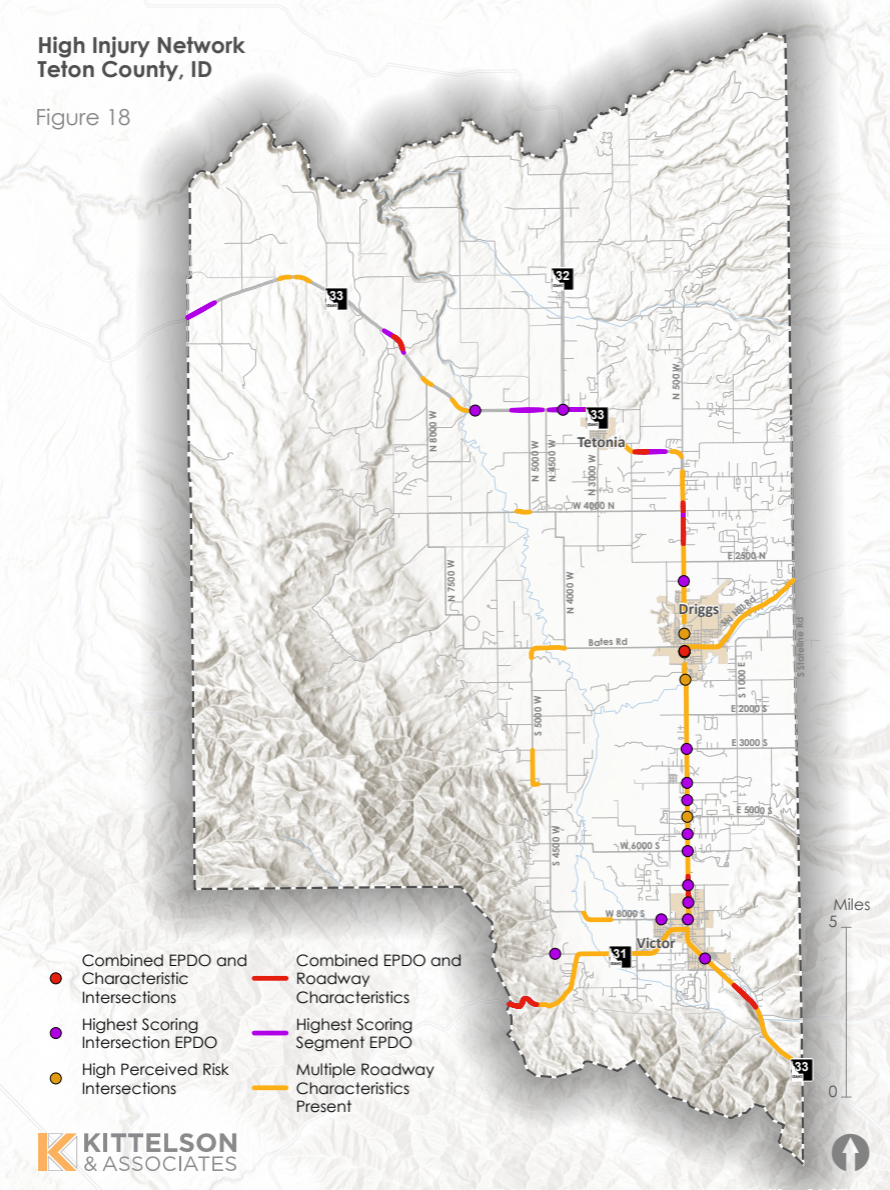 The High Injury Network (HIN) for Teton County identifies areas where investments in transportation safety could have the greatest impact in reducing fatal and serious injury crashes. The HIN combines the results of the high frequency and severity crash analysis and the roadway characteristic assessment. To create the HIN, these analysis layers were overlaid onto a single map.