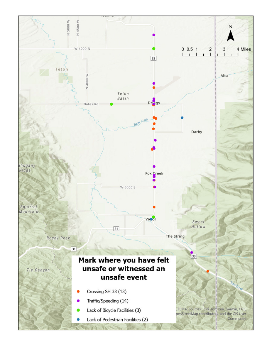 Unsafe incidents due to lack of bicycle facilities were identified on Bates Road, in the town of Victor on SH 33, and at 4000 N and SH 33. Similar comments for pedestrian related incidents occurred on E 1000 S and in Downtown Victor. The locations identified reflect the need for safety improvements at segments and intersections predominantly along SH 33.