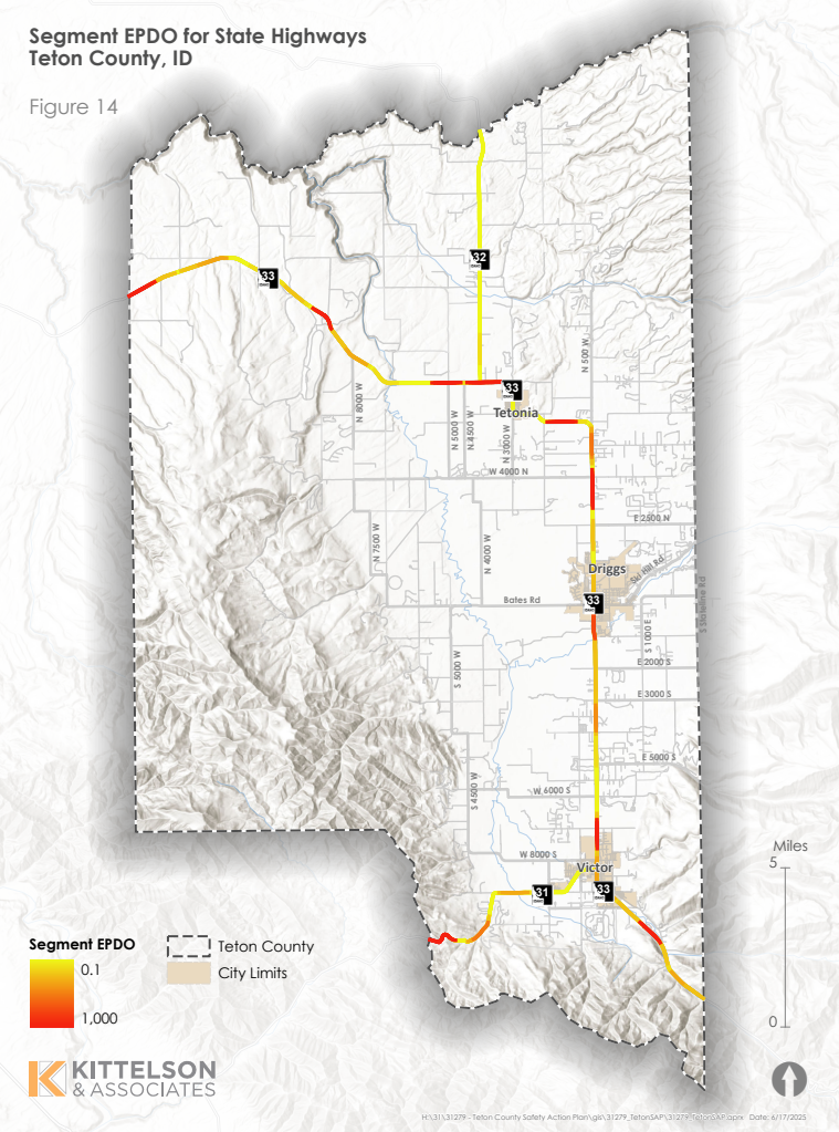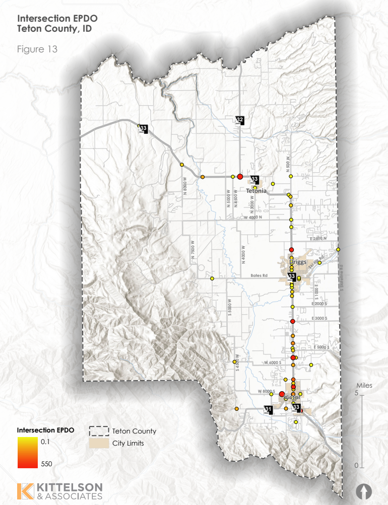 Of the 73 intersections in Teton County with EPDO values greater than zero, 34 (approximately 47%) intersections are located within the city limits of either Driggs, Tetonia, or Victor. Of the 15 intersections with at least one suspected minor injury crash, 4 (approximately 27%) are located within city limits. 13 of the 15 intersections with at least one suspected minor injury crach (approximately 87%) are located along Highway 33 (ID 33). The map below shows the EPDO value for all intersections with a score greater than zero.