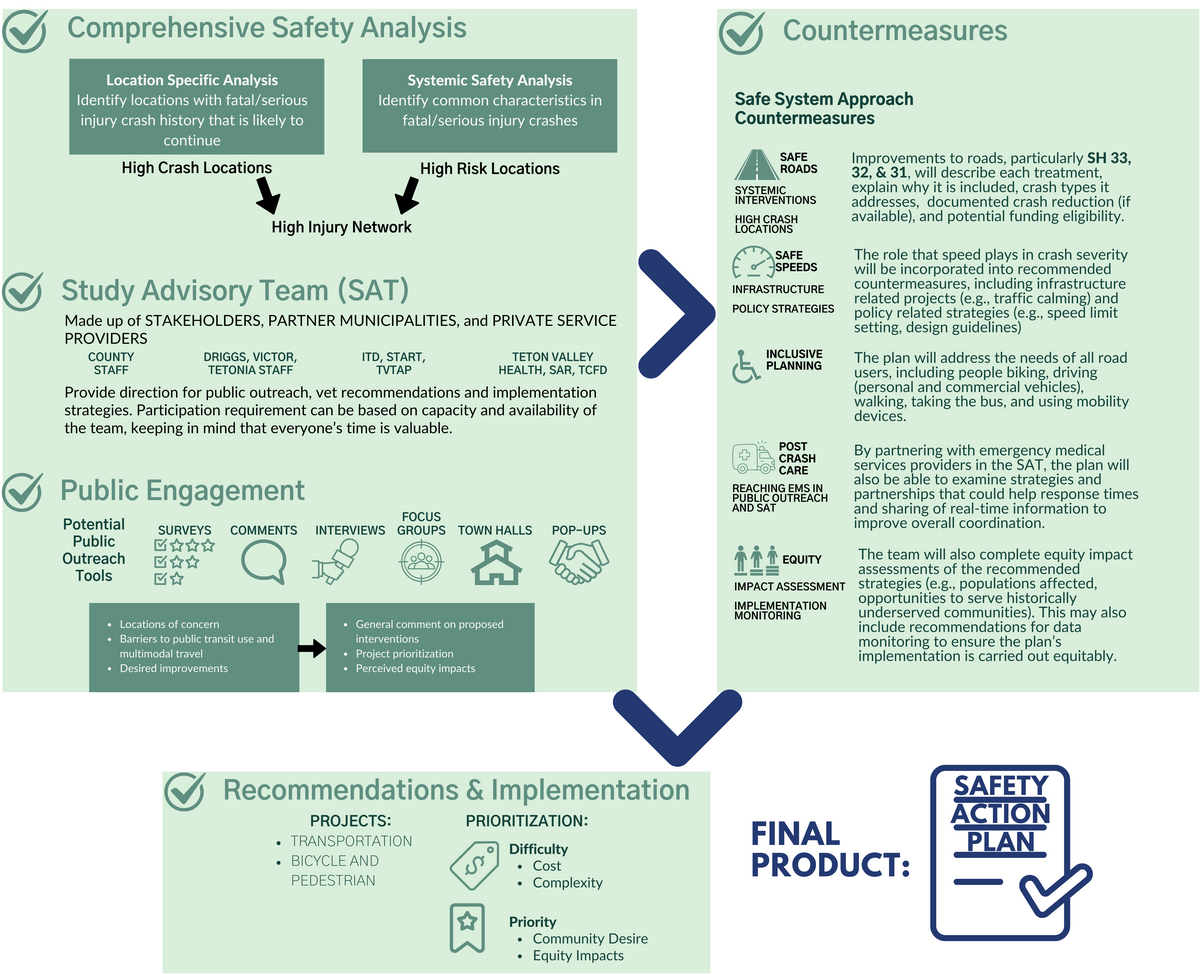 SS4A provides a significant amount of funding to communities across the county for planning and building safety improvements. There are several steps in the grant program. Last year Teton County was awarded a Planning and Demonstration Grant. This year we are using that grant to create a Safety Action Plan, and next year we will use our Safety Action Plan to apply for an Implementation Grant, allowing us to make the Plan into reality.